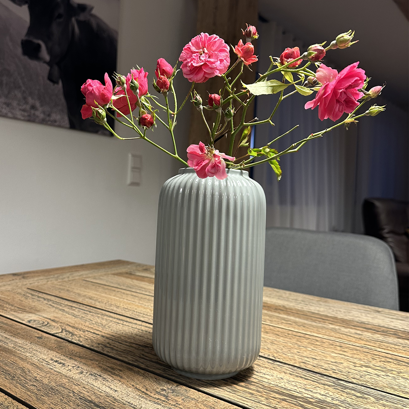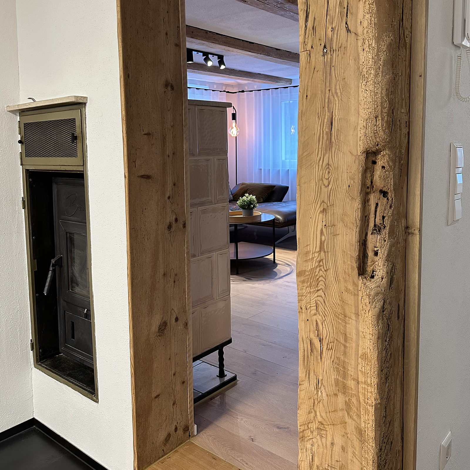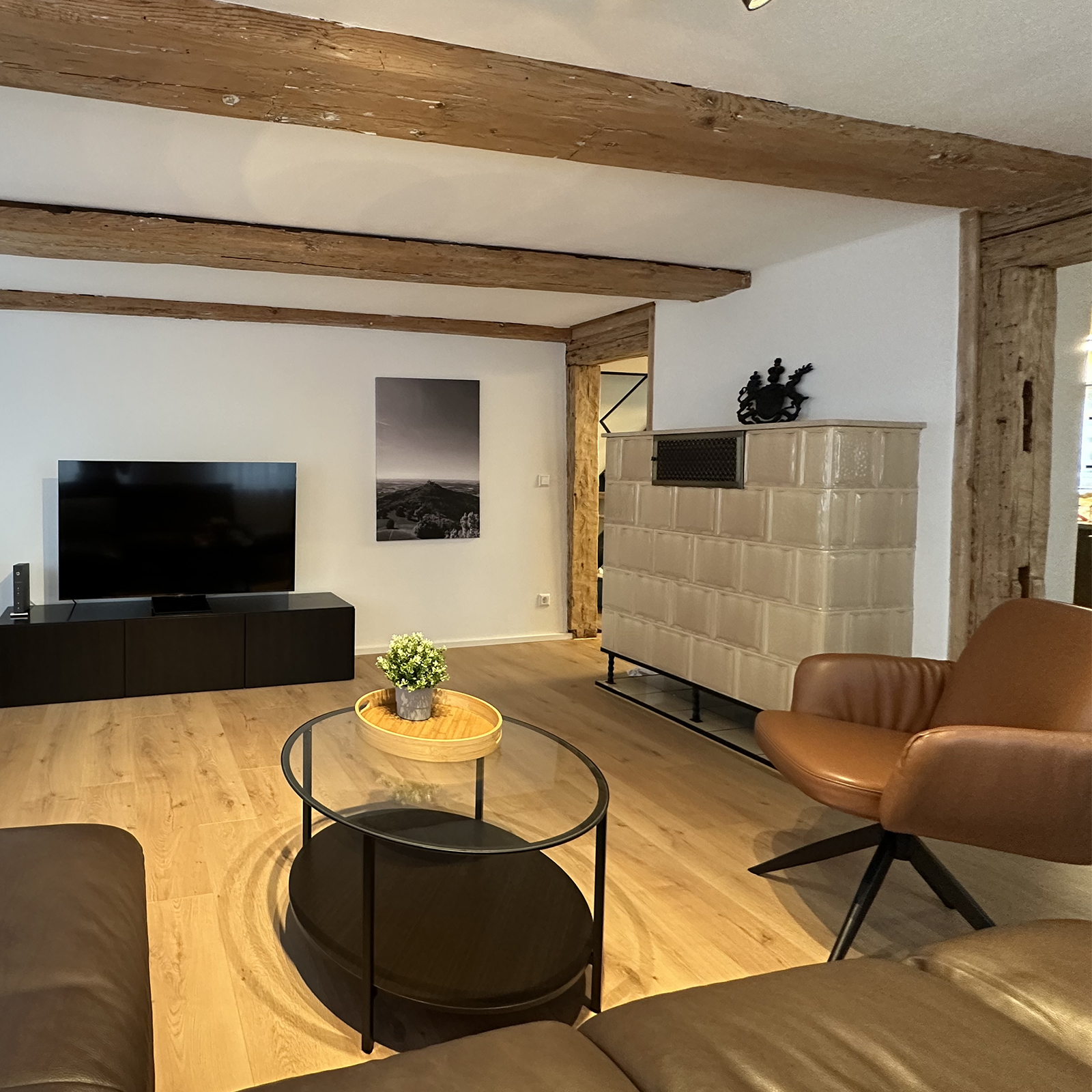Im Erdgeschoss des Ferienhauses befindet sich ein heller und gemütlicher Wohnbereich mit Ledersofa, Fernseher, WLAN und traditionellem Kachelofen, der besonders an kühleren Tagen eine angenehme Atmosphäre schafft. Gegen einen Aufpreis von 5 € stellen wir Ihnen gerne einen Korb Brennholz inklusive Anzündmaterial zur Verfügung – geben Sie uns einfach vor oder während Ihres Aufenthalts Bescheid.