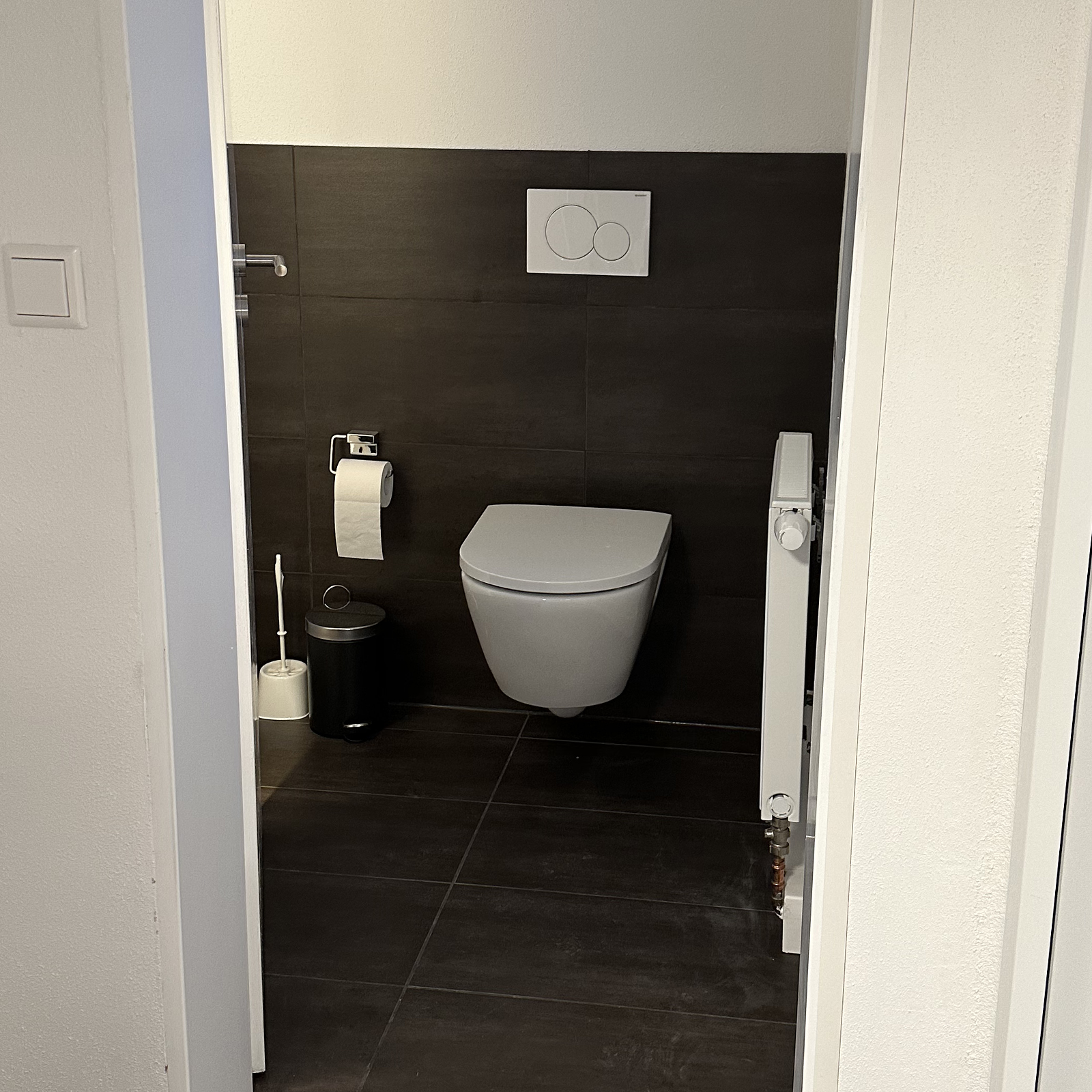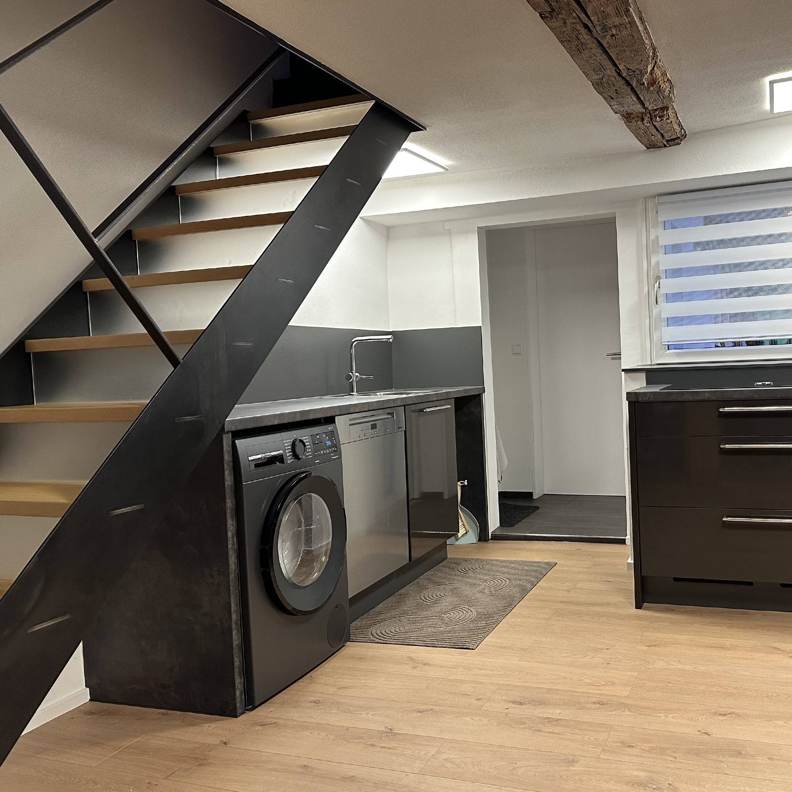 Direkt angrenzend befindet sich die voll ausgestattete Küche mit Essbereich. Ein großer Esstisch mit Platz für bis zu sechs Personen lädt zu gemeinsamen Mahlzeiten ein. Zur Ausstattung gehören ein Induktionsherd, Backofen, Geschirrspüler sowie eine Nespresso- und Filterkaffeemaschine. Zusätzlich stehen im Erdgeschoss eine Waschmaschine sowie ein separates WC zur Verfügung.